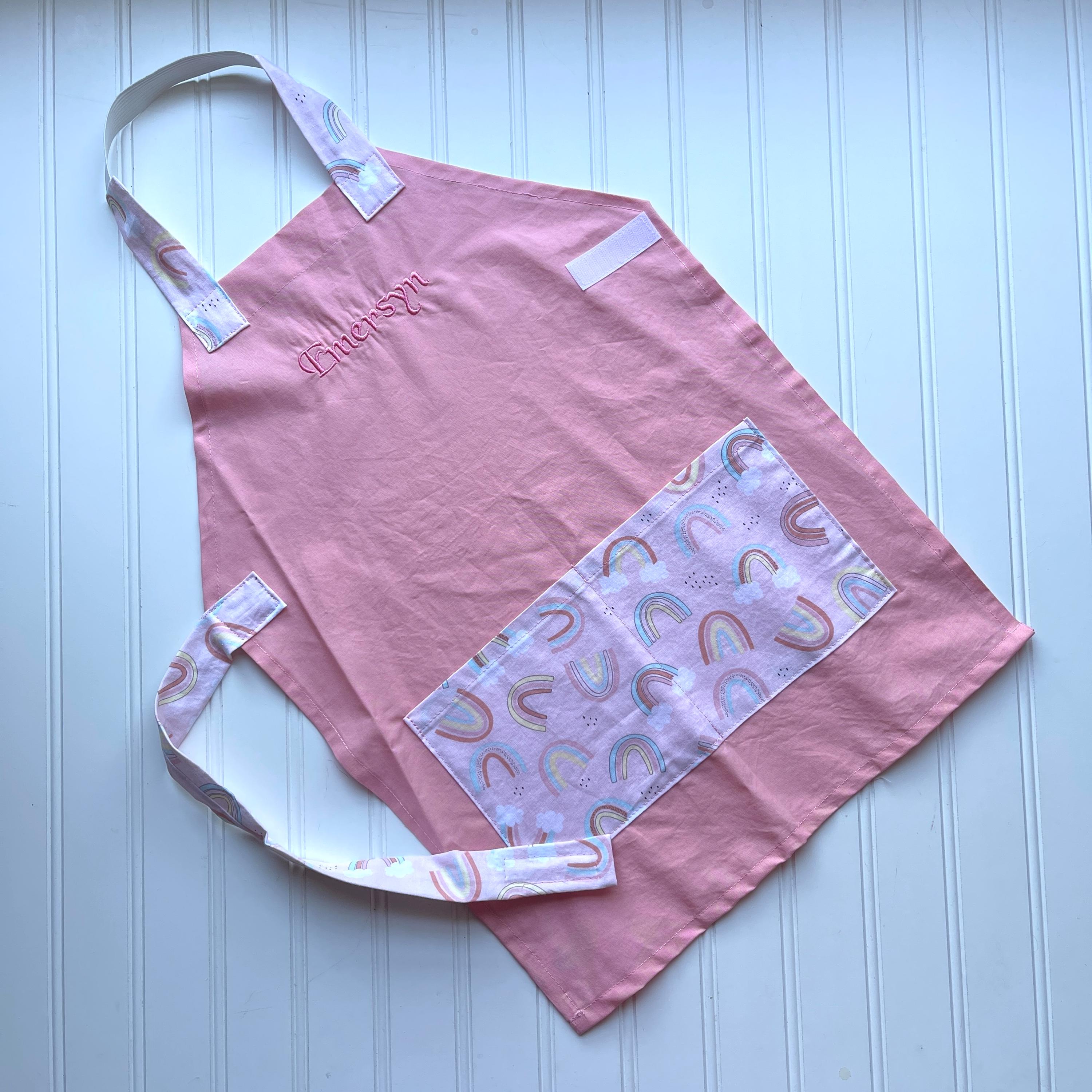 Our handmade aprons are designed with moms and kids in mind. Your little one can put his apron on "all by herself" and come be a helper in the kitchen. Perfect for baking, craft projects and pretend play. Custom embroidery with your little chef's first name is the icing on the cake - this apron will be a huge hit as a birthday or Easter basket surprise.