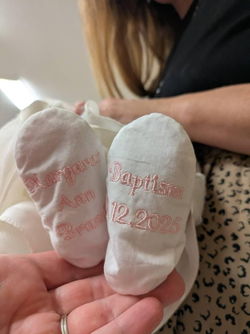 Price includes a pair of crib shoes with embroidered cross on toes and Christening/Baptism date on one sole and first and middle name on the other sole. Embroidery comes in your choice of colors - please select embroidery color from drop-down menu.