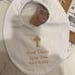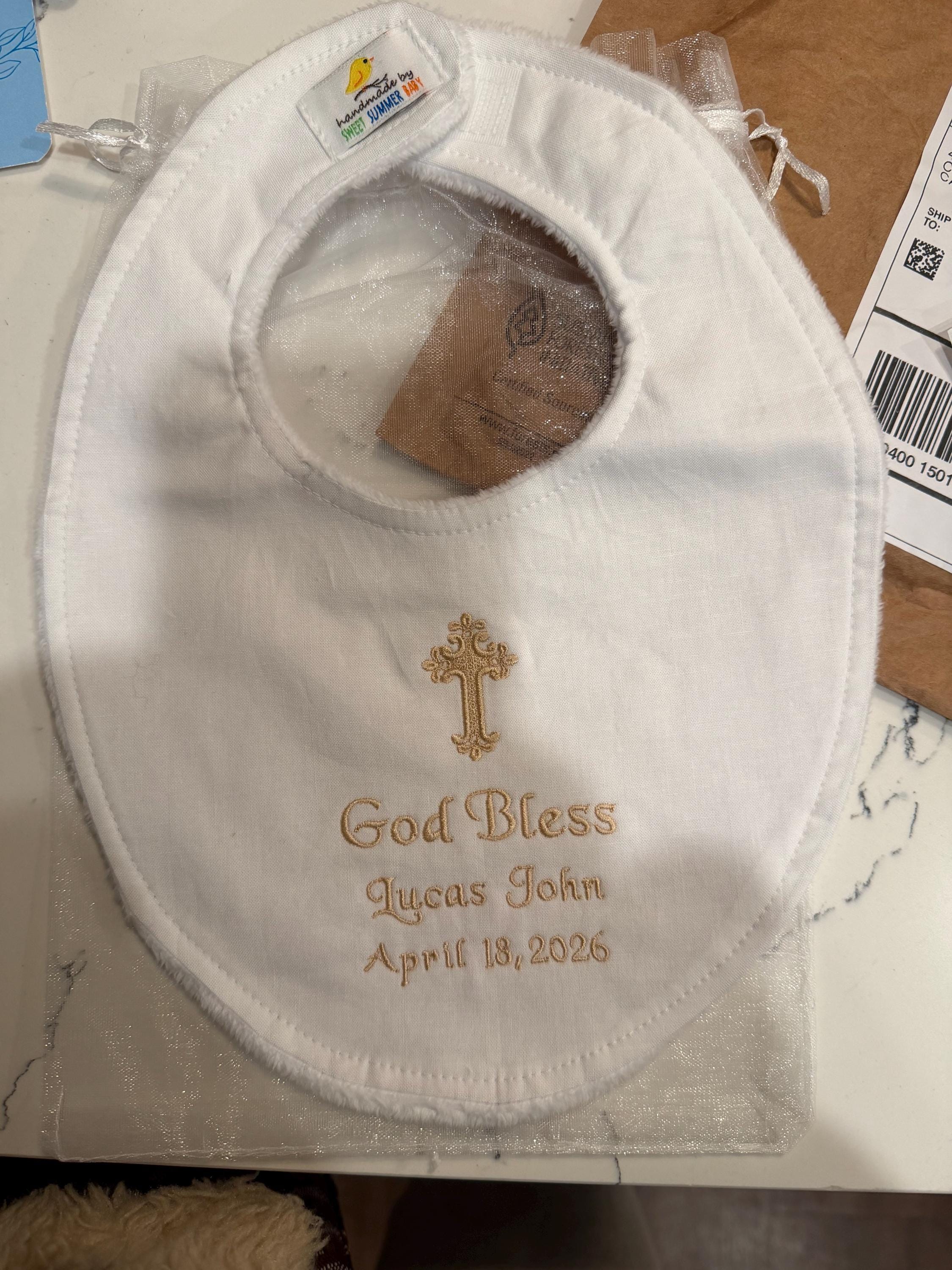 Each handmade bib has a cotton front and snuggly minky backing with a Velcro fastener on the convenient back closure. Set includes one bib embroidered with child's first, middle and/or last name, baptism date, and cross. Bib measures 12" x 9"