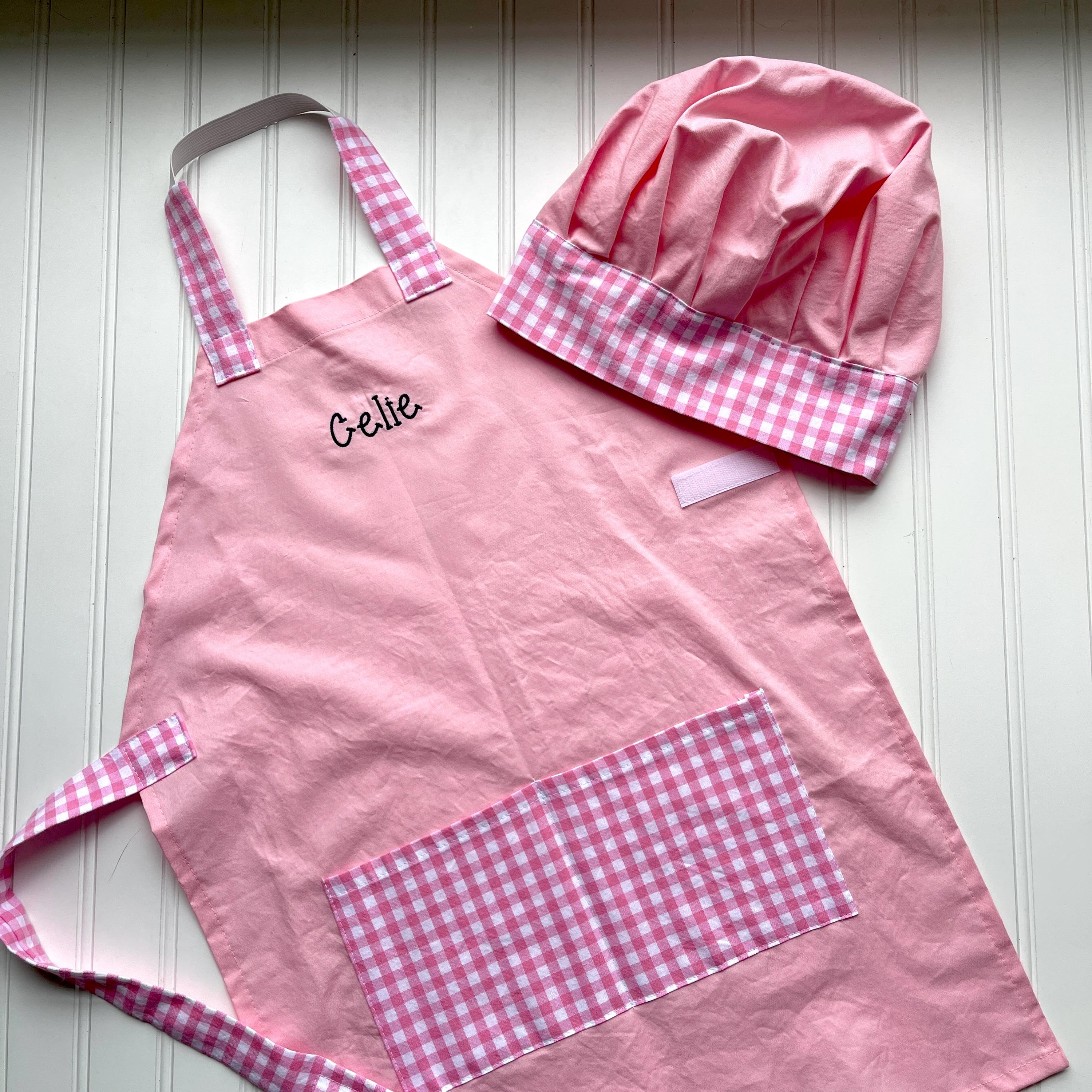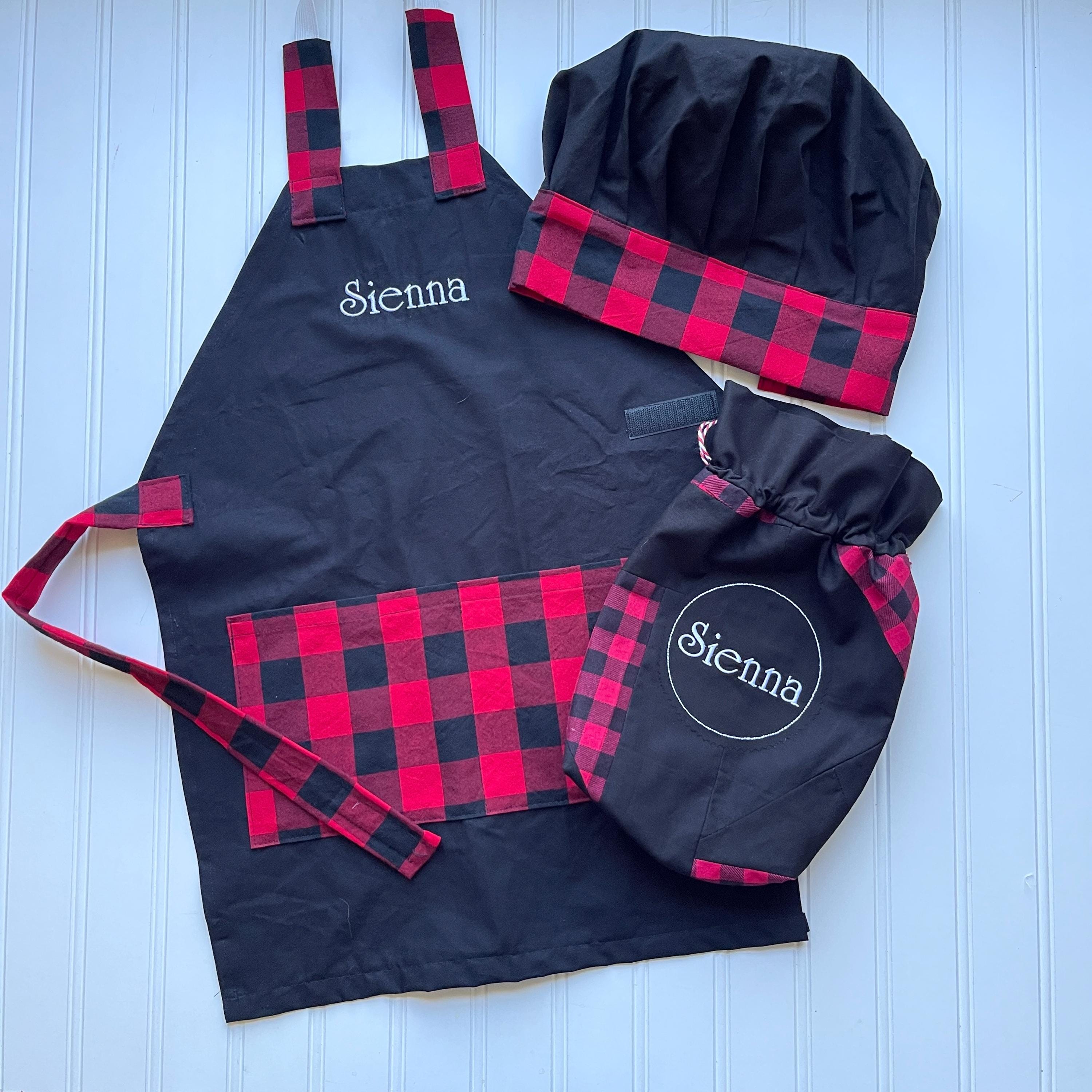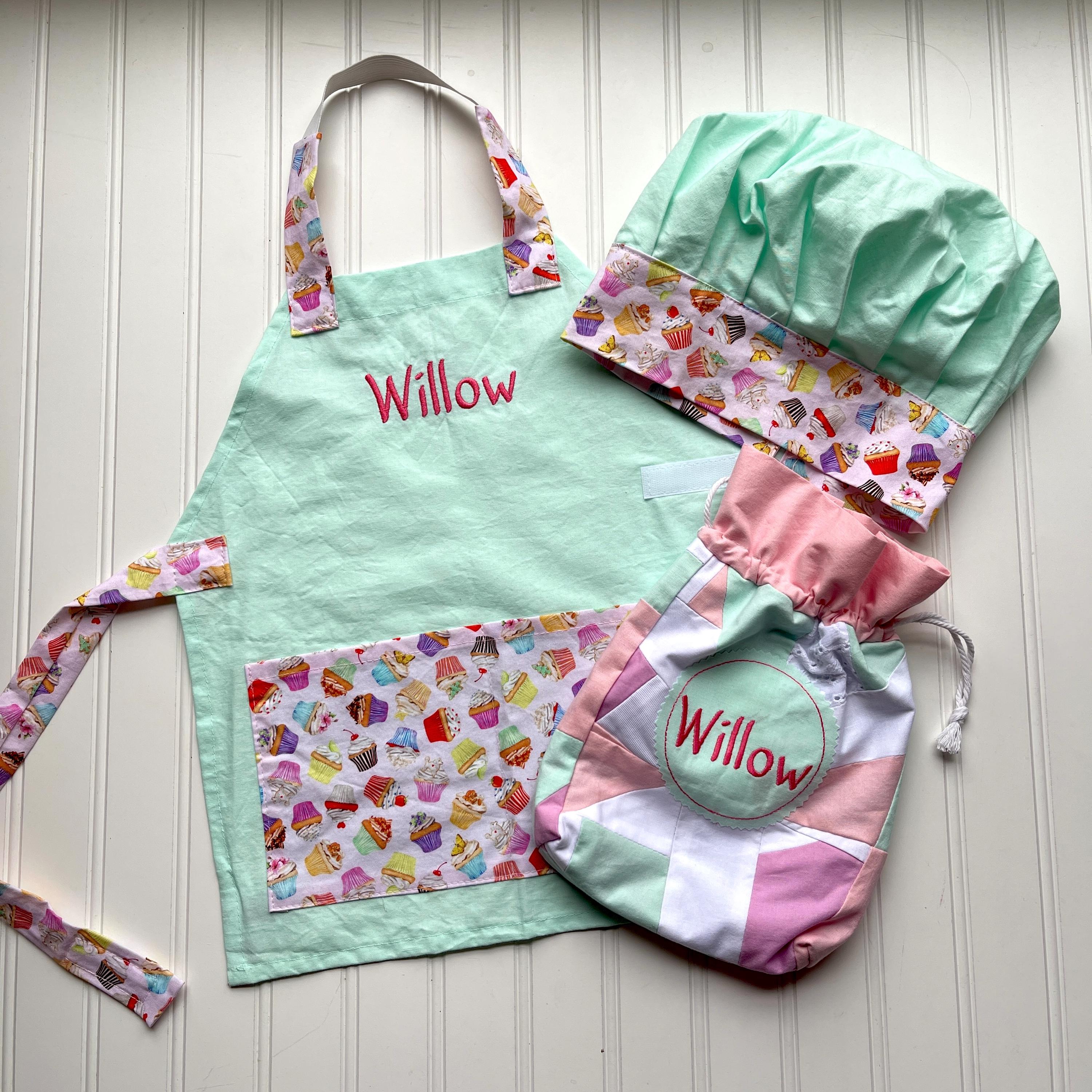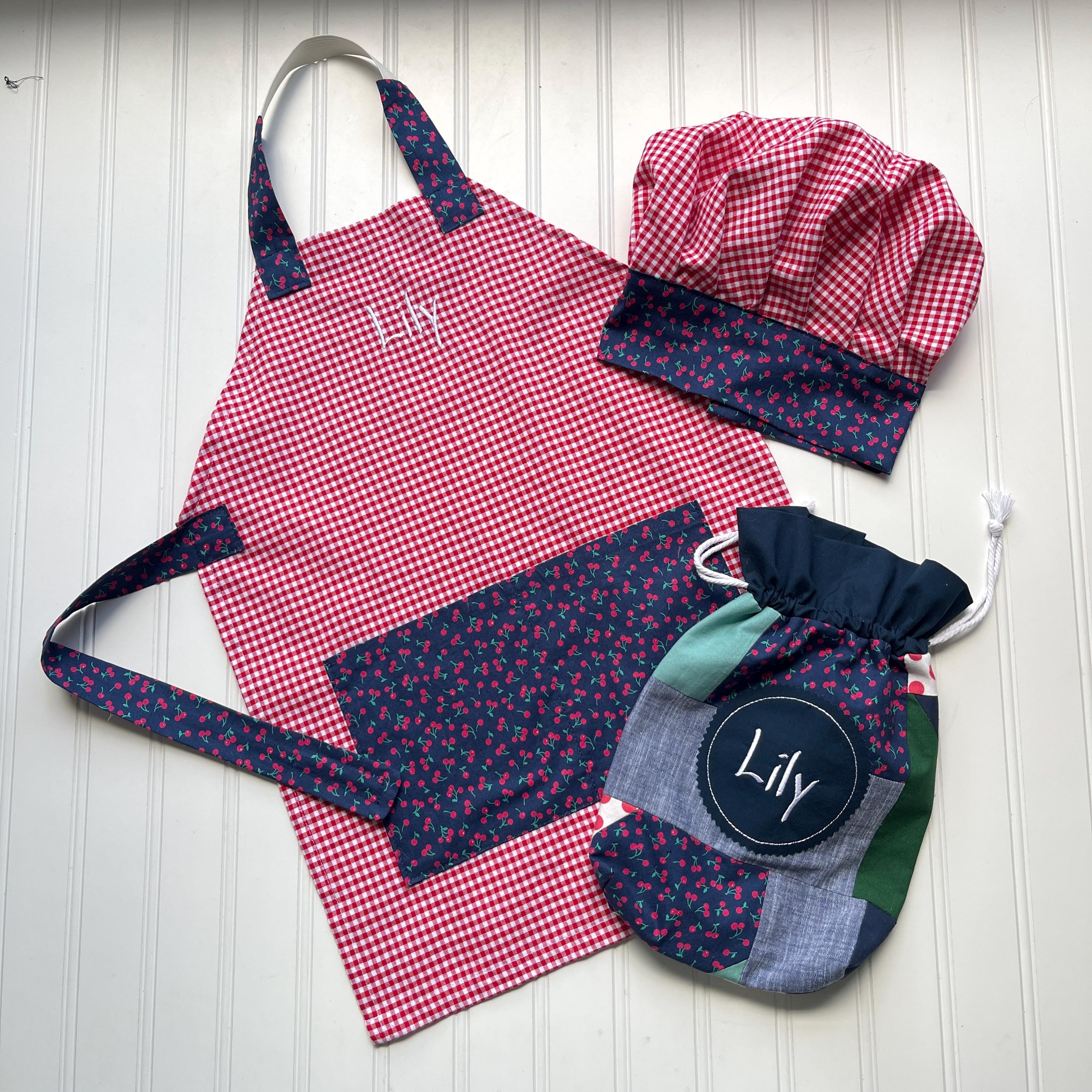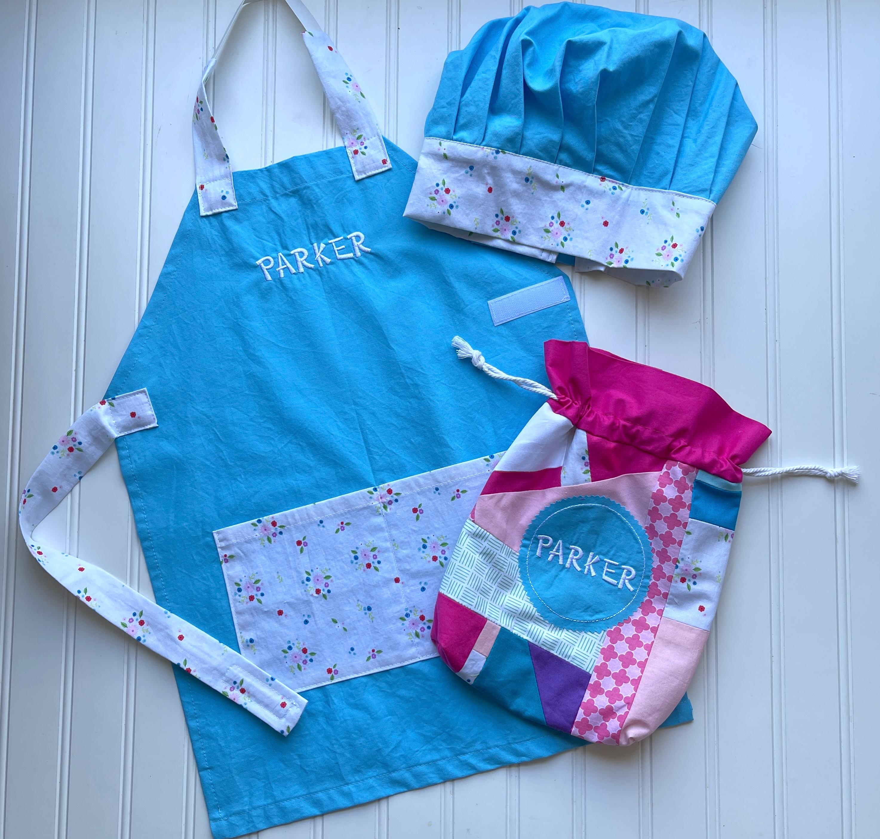 Price includes one handmade apron and child's name embroidered on the apron and one matching handmade chef's hat (hat is not personalized)