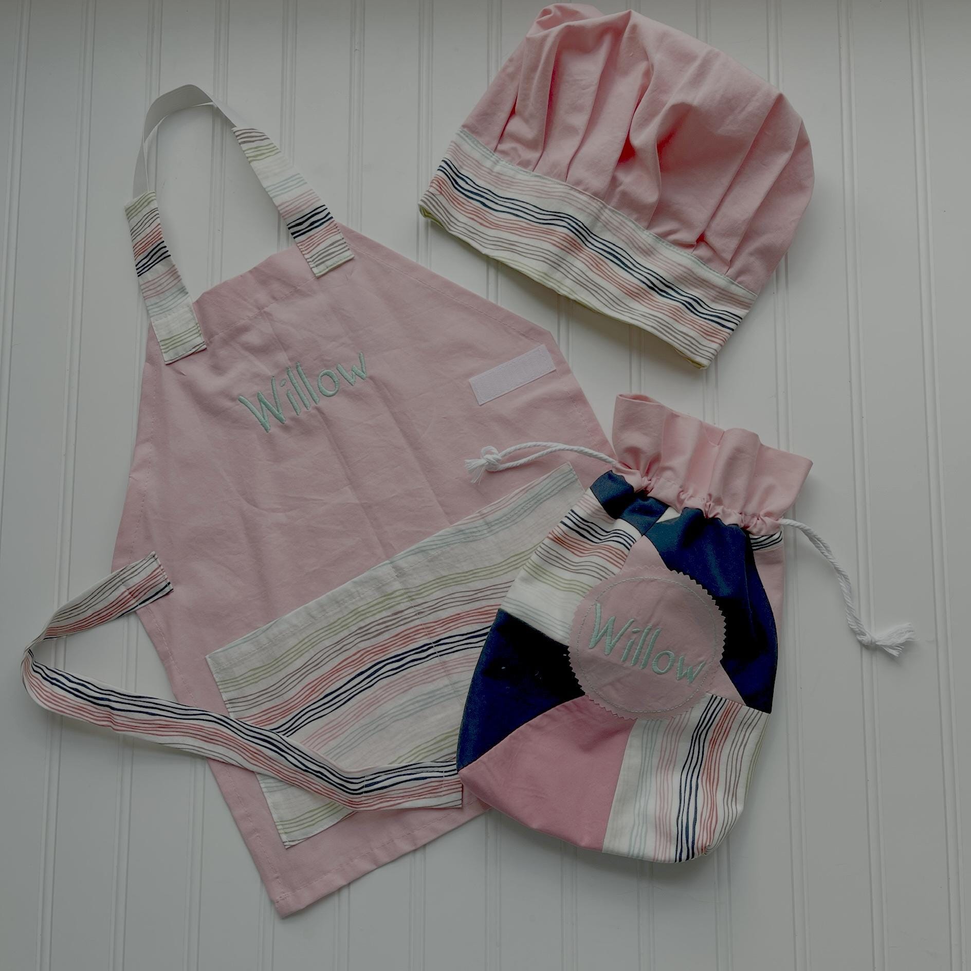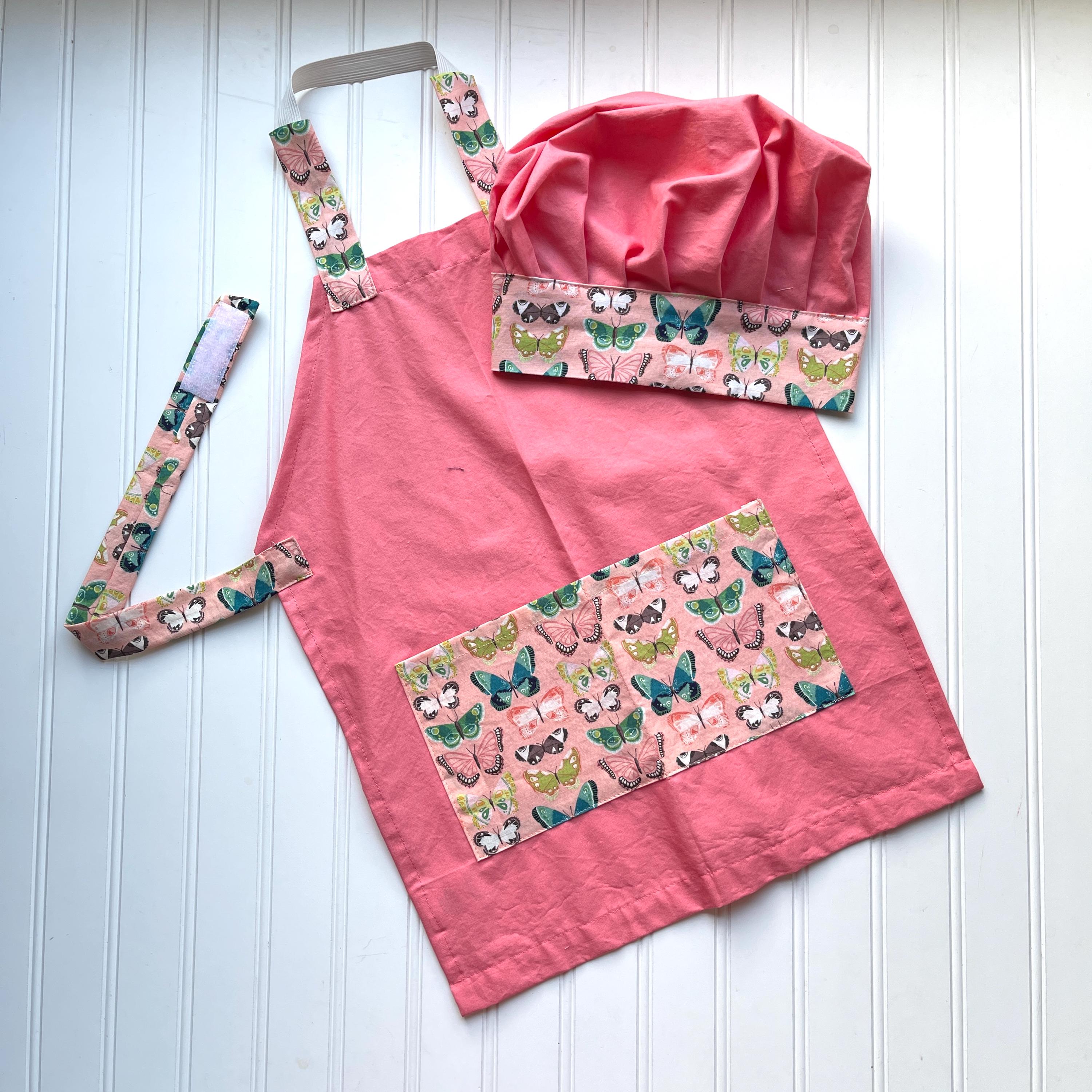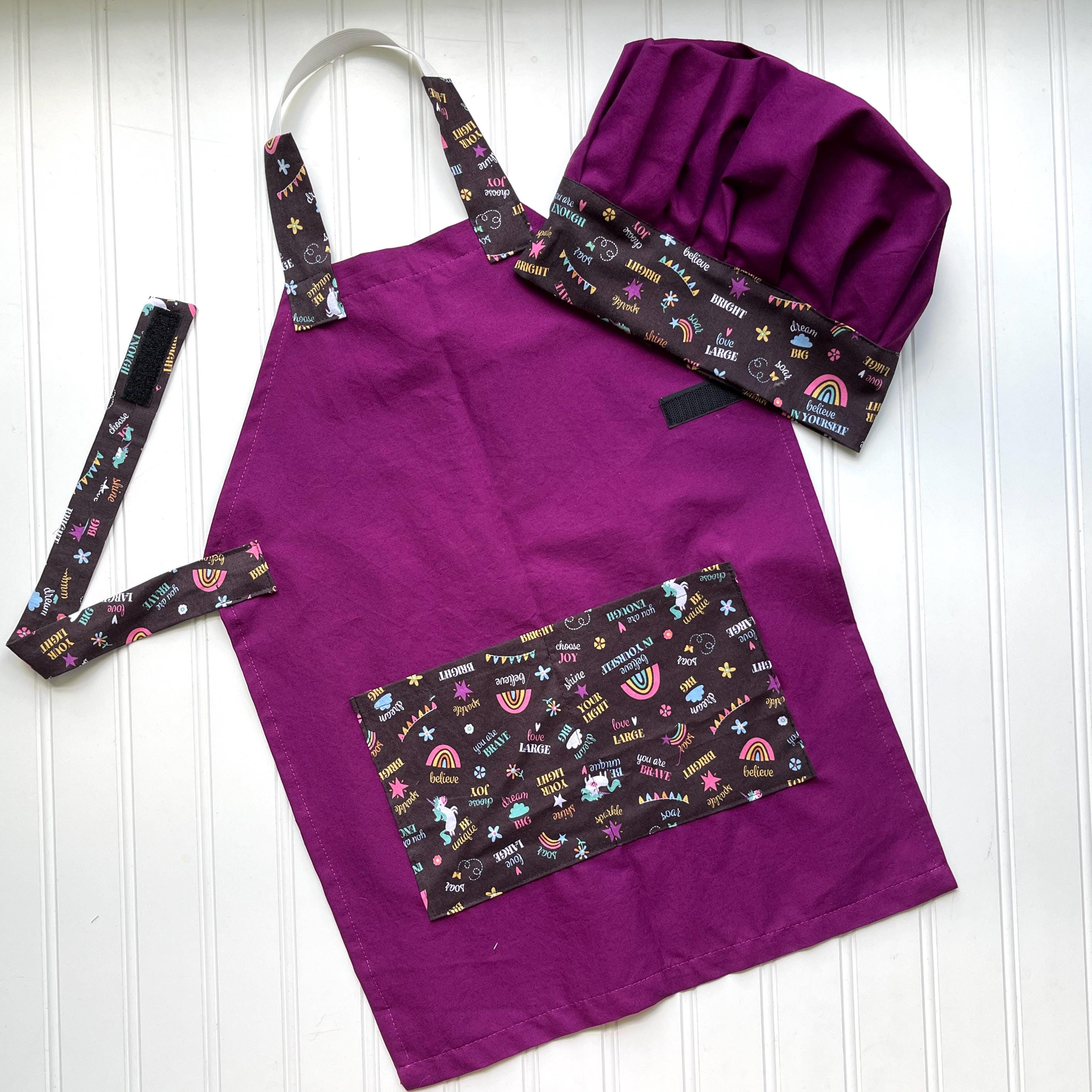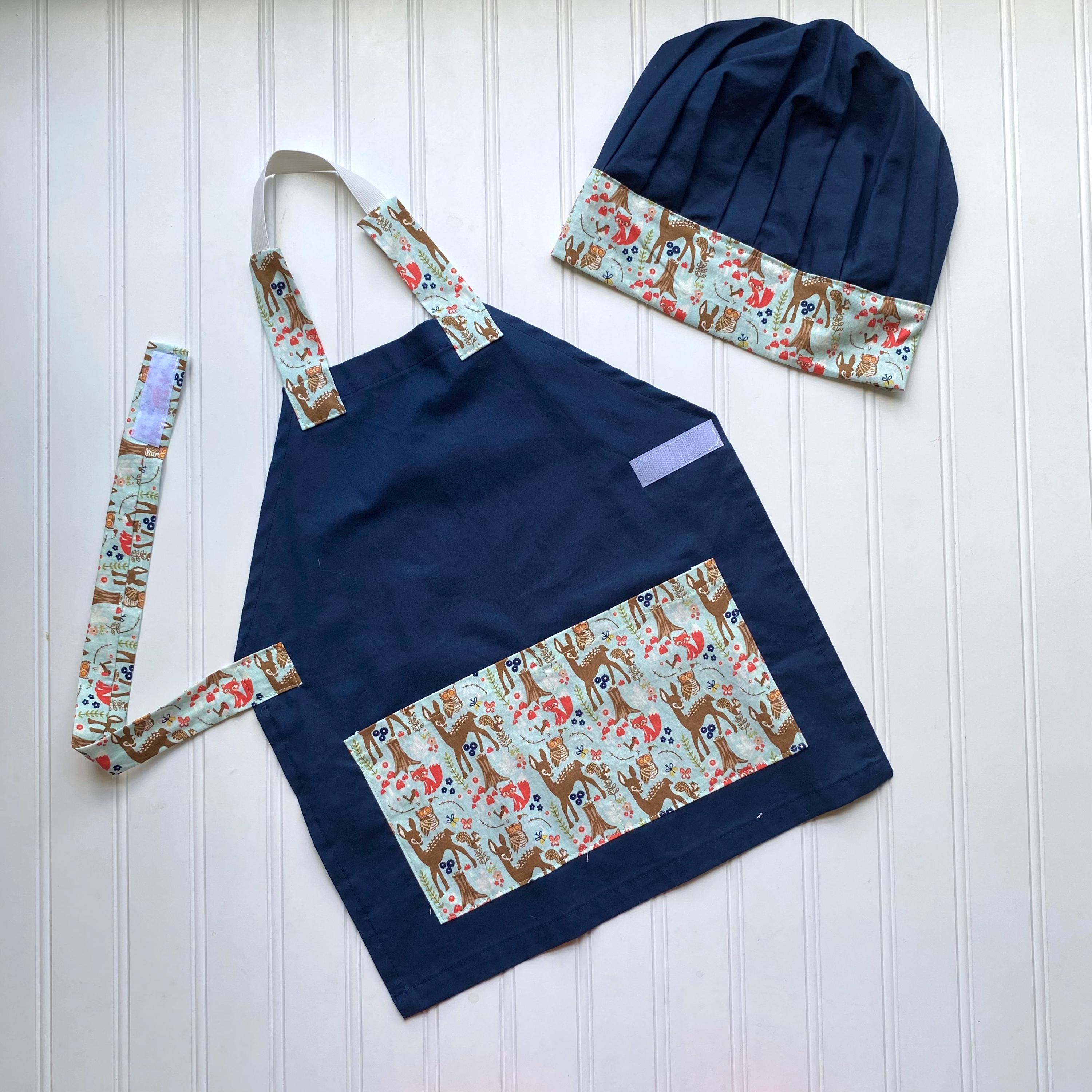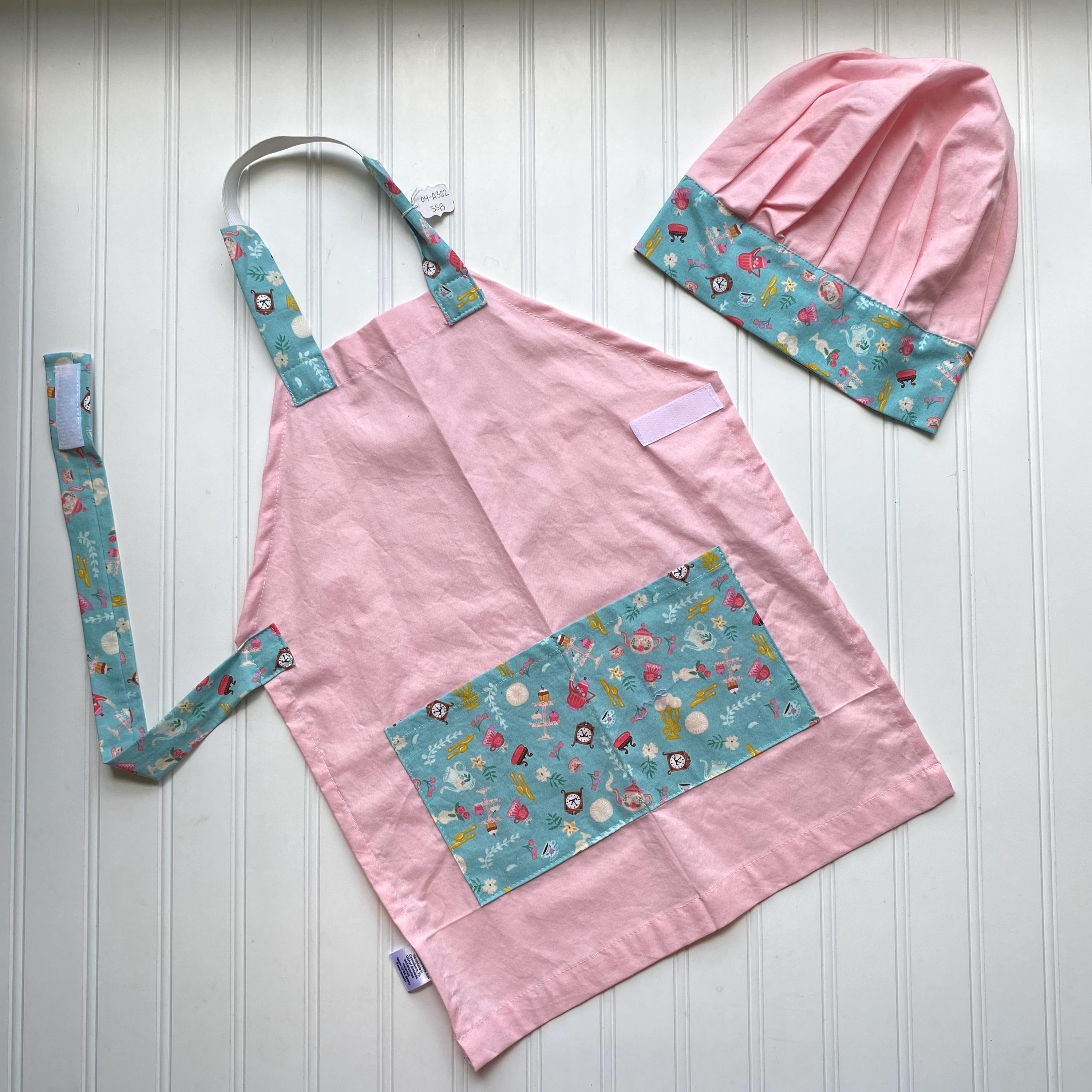 Price includes one handmade apron and child's name embroidered on the apron and one matching handmade chef's hat (hat is not personalized)