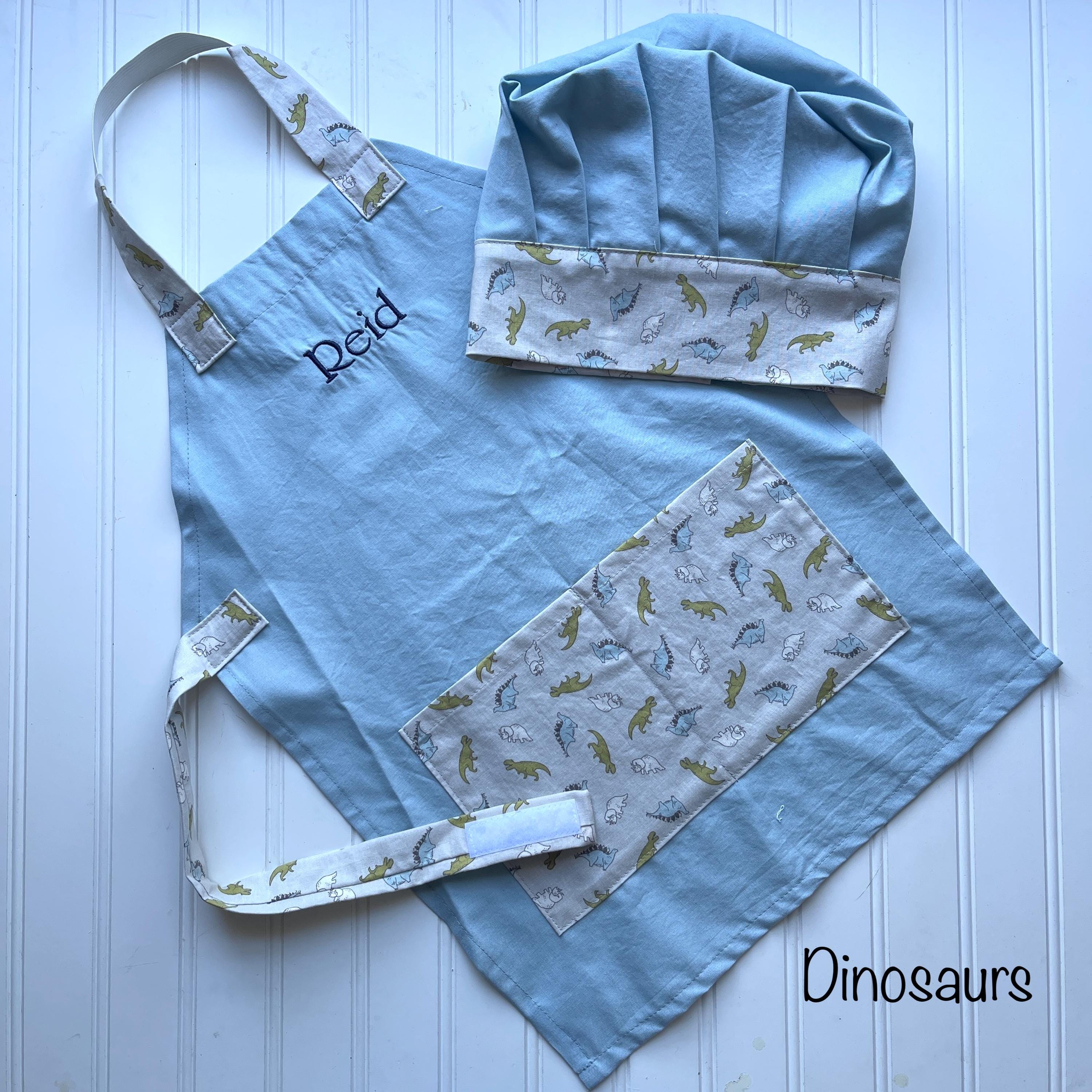 Price includes one handmade apron and child's name embroidered on the apron, one coordinating handmade chef's hat (hat is not personalized), and one gift bag with child's name.